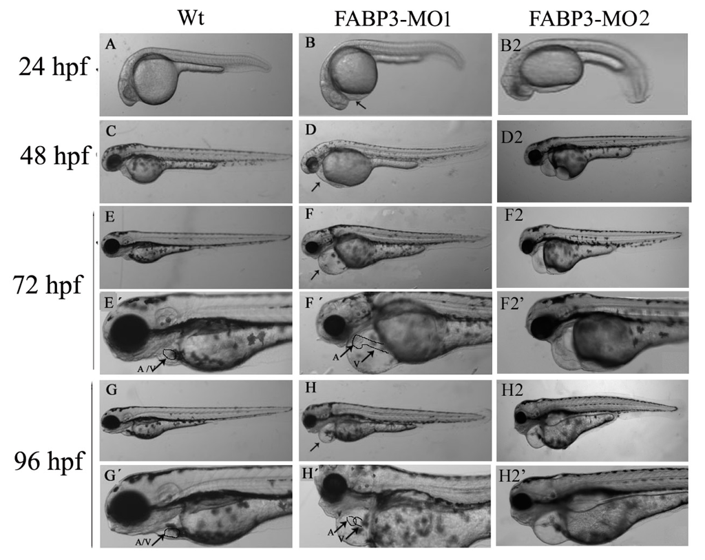 Microinjection of FABP3-MO induced abnormal embryonic development, particularly in the heart. Representative images of zebrafish embryos are shown. Compared to the Wt-MO group (A), embryos injected with FABP3-MO at 24 hpf (B, B2) displayed slightly pericardial edema (black arrows and developmental delay). At 48 hpf, FABP3-MO1 and FABP3-MO2 injected zebrafish embryos (D and D2) displayed phenotypes similar to the embryos treated at 24 hpf, except with abnormal somites and head malformations which were not seen in age-matched control embryos (C). These defects appeared more severe at 72 hpf in the FABP3-MO1 and FABP3-MO2 group (F, F2) compared to the control group (E). Similarly, severe abnormalities were observed in FABP3-MO1 and FABP3-MO2 injected embryos at 96 hpf (H, H2), but not control embryos (G). Higher magnification (630 multiple) images of embryos are shown in part 2 at 72 and 96 hpf. FABP3-MO injected embryos show overlapping of the ventricle and atrium, and a linear heart tube at 72 hpf (F′, F2′), which was not evident in control embryos (E′). Similarly, the ventricle and atrium could be viewed at the same position at 96 hpf embryos in the FABP3-MO group (H′, H2′), but not in the control group (G′). V: ventricle; A: atrium.