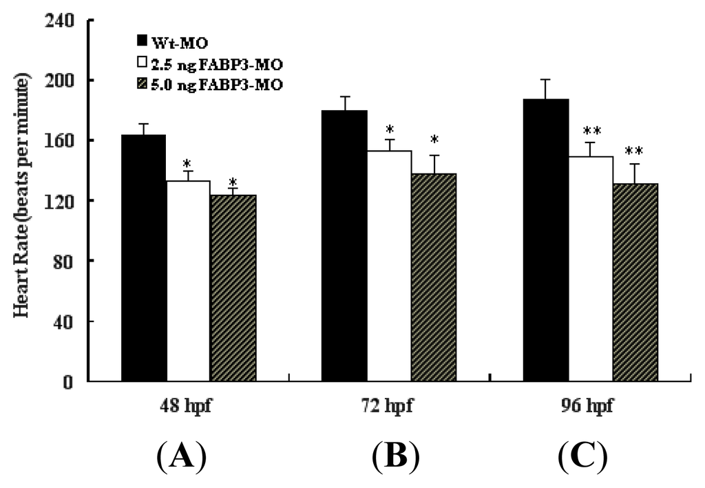 FABP3-MO decreased heart rate in zebrafish embryos. Heart rate, measured in bpm, was counted in embryos injected with 2.5 and 5.0 ng FABP3-MO at 48, 72 and 96 hpf. The heart rate decreased in FABP3-MO injected embryos, compared to Wt-MO at 48 (A), 72 (B) and 96 hpf (C). Note that the heartbeat was gradually elevated with increasing age in Wt-MO and FABP3-MO at the three time points (A–C). * p < 0.05; ** p < 0.01.