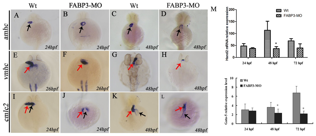 Effect of FABP3-MO on the expression of cardiac-specific genes in zebrafish. Cardiac-specific markers amhc (24 and 48 hpf), vmhc (26 and 48 hpf) and cmlc2 (24 and 48 hpf) were used to observe cardiac morphology within the whole embryo using in situ hybridization (red arrows), and the expression of Hand2 was assayed by real-time PCR at 24, 48 and 72 hpf, respectively. Compared to Wt-MO (A), amhc expression was abnormally positioned (B) at 24 hpf, and was significantly downregulated in FABP3-MO injected embryos at 48 hpf (D), as compared to control embryos (C). Vmhc expression was also in an abnormal position and appeared lower in FABP3-MO treated embryos at 24 hpf (F) and 48 hpf (H), compared to control embryos at 24 hpf (E) and 48 hpf (G), respectively. Cmcl2 expression revealed that heart looping was incomplete and formed a liner cardiac tube in FABP3-MO injected embryos (K), compared to the normally looped heart in control embryos (K). Hand2 and Gata5 expression is downregulated in zebrafish induced by FABP3-MO compared to Wt-MO at the three time points examined (M). * p < 0.05.