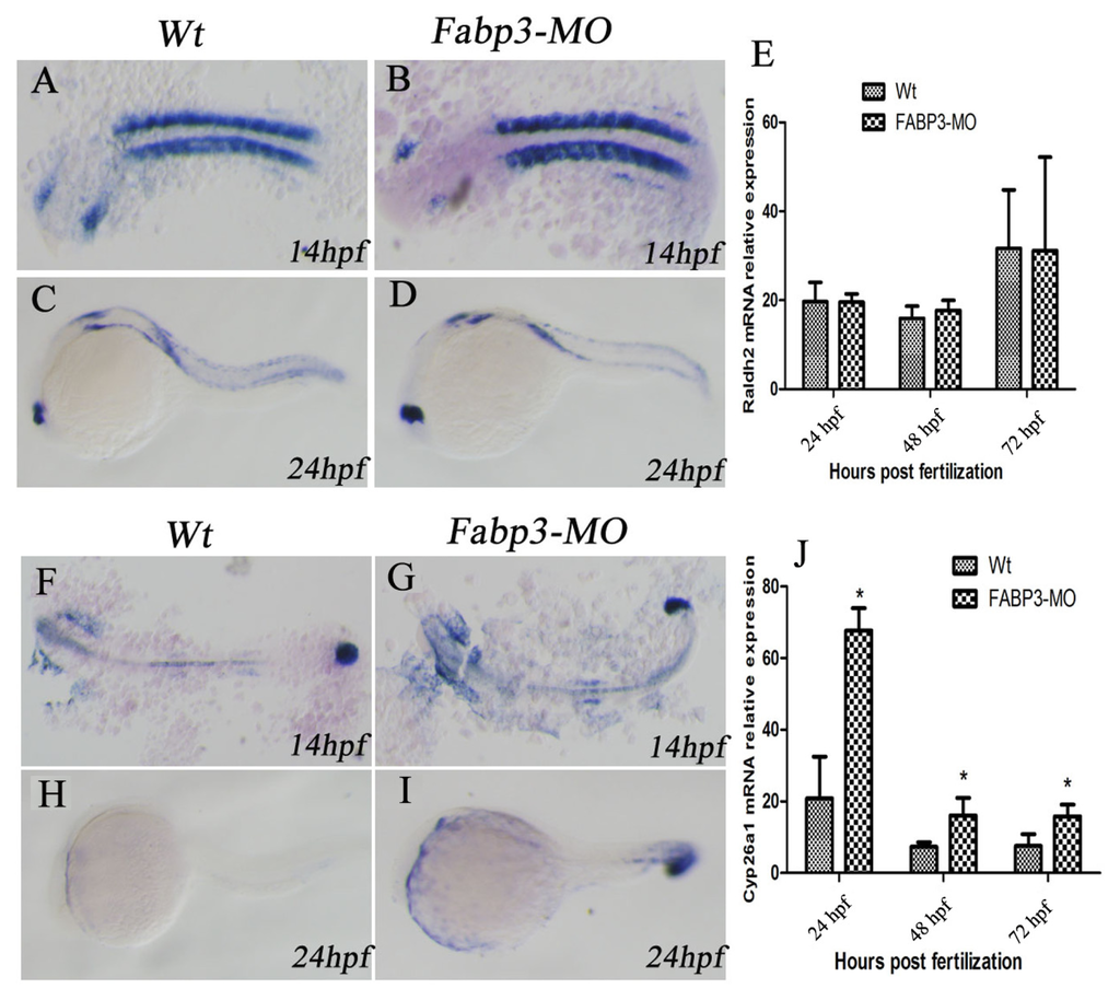 FABP3-MO alters the retinoic acid signaling pathway. Raldh2 expression was not significantly different in FABP3-MO injected zebrafish, as visualized by in situ hybridization at 14 hpf (B) and 24 hpf (D), compared with Wt controls at 14 hpf (A) and 24 hpf (C), respectively. Stable expression levels of Raldh2 were also confirmed by real-time PCR (E). Cyp26a1 expression was significantly upregulated in FABP3-MO injected zebrafish, as visualized by in situ hybridization at 14 hpf (G) and 24 hpf (I), compared with Wt controls at 14 hpf (F) and 24 hpf (H), respectively. Increased expression levels of Cyp26a1 were confirmed by real-time PCR (J).* p < 0.05.