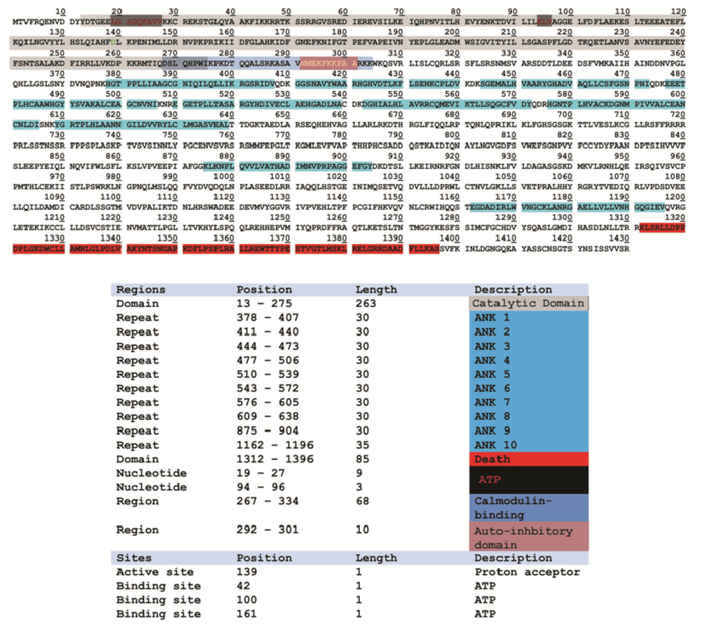 Amino acid sequence (single-letter amino acid code) for DAPk1 adapted from UniProt database. The structural and functional domains of DAPk1 and critical amino acid residues and domains are marked in the table.