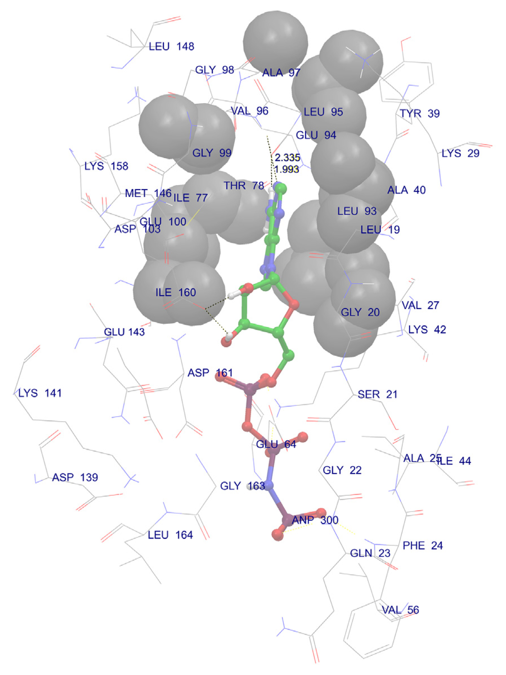 The Crystal structure of the catalytic domain of Dapk1 with docked ligand ANP (Phosphoaminophosphonic Acid-Adenylate Ester) showing important H-bond interactions (Black dotted lines). The grey spheres represent hydrophobic enclosures.