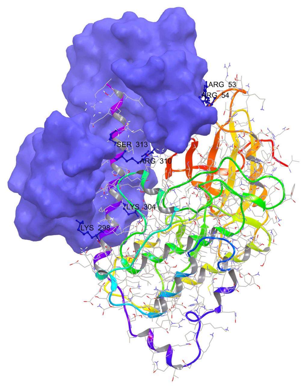 In order to further analyze the CaM binding region we retrieved, from the crystal structure of the binary DAPK-CaM complex, the DAPK catalytic domain and adjacent autoregulatory domain complexed with CaM from PDB (PDB code: 1IG1) [26] and critically analyzed the structures. Protein structures were prepared in the same way as stated in section 4.1. The observed CaM interactions with the DAPk catalytic domain were restricted to the first helix of the N-terminal CaM lobe, two residues (Arg 53, Arg 54) of the DAPk family–specific basic loop, and two additional residues (Arg 23, Lys 222) from other Catalytic Domain surface loops. We found that the main interacting residues in the CaM-binding domain are Lys304, Ser308, Lys298 and Arg310 (Figure 3).