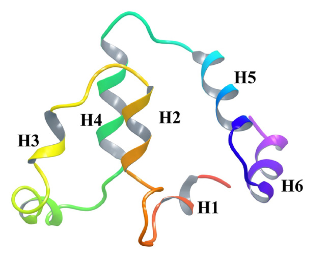Ribbon representation of a homology model of the DAPk1 death domain. Alpha helices are labelled from H1 to H6.