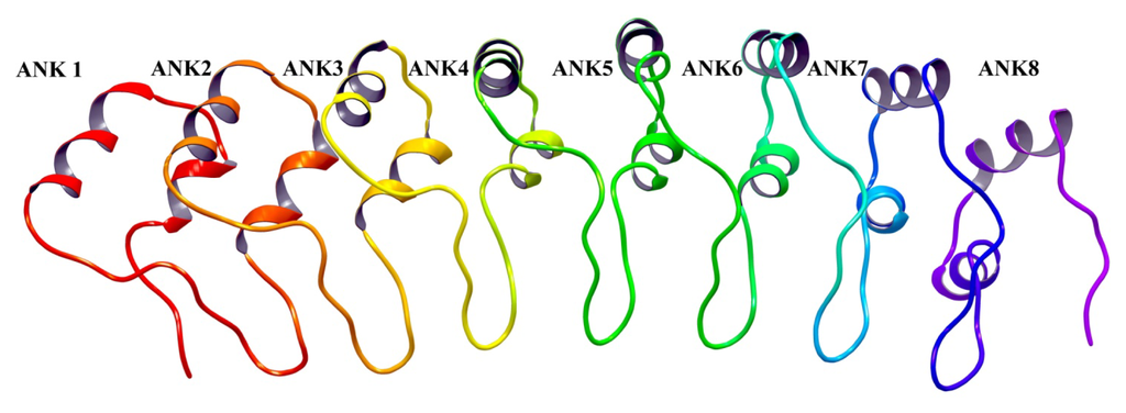 The ankyrin repeats facilitate protein-protein communications and are implicated mostly in DAPk1 degradation. s-DAPk-1, an alternatively spliced product lacking the DAPk1 kinase domain regulates the steady-state levels of the full-length DAPk-1 and is implicated in proteasome-independent degradation pathway for DAPk1 [31] The ankyrin repeats also facilitate the DAPk1 degradation via the ubiquitin-proteasome pathway. The E3 ubiquitin ligase DIP-1 (MIB-1) interacts with the ankyrin repeats and is able to actively ubiquitinate and degrade DAPk1 [32]. As DAPk interacts with HSP90 through its kinase domain, the E3 ubiquitin ligase carboxyl terminus of HSC70-interacting protein (CHIP), which facilitates the ubiquitination of HSP90-interacting proteins, will also induce DAPk1 degradation [33,34]. The crystal structure of the ankyrin repeats of DAPk1 has not been described and we have used similar approaches as above to develop a homology model of ankyrin repeats. As the ankyrin repeat of DAPk1is a protein–protein interaction domain the homology model developed can be used for protein-protein interaction studies, and identification of protein hotspots, which represent the first step in rational drug design projects (Figure 5).
