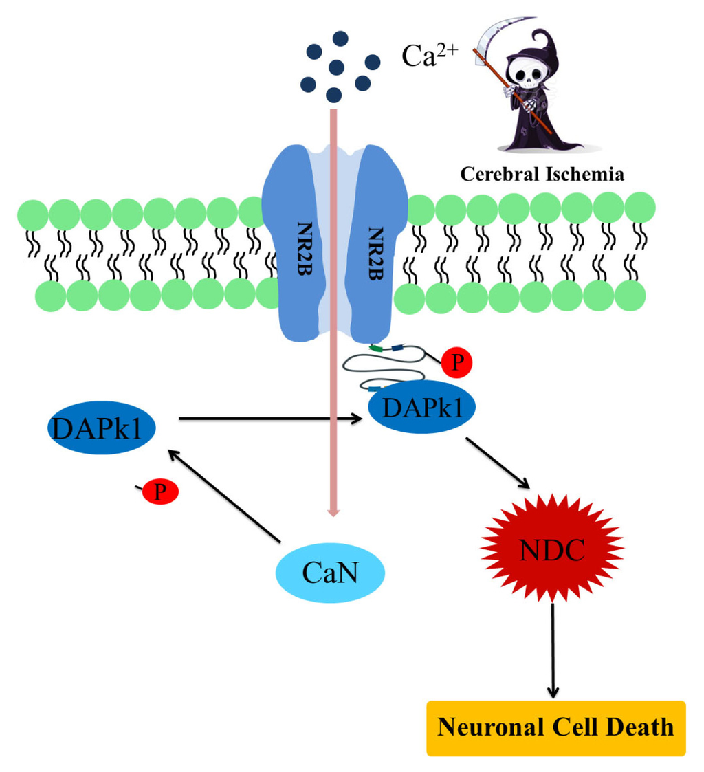 Proposed DAPk1-mediated cell death pathway. Cerebral ischemia results in Ca2+ influx through the NMDA receptor channel, which activates calcineurin (CaN) and dephosphorylates DAPk1 at pS308. This leads to activation of DAPk1, which in turn phosphorylates the NR2B subunit of the NMDA receptor. DAPk1 recruitment then promotes the activation of death-signaling proteins in a neuronal death signaling complex (NDC). The NDC include all neuronal death-signaling proteins that closely associate with the NMDAR channel pore like the NR2B–PSD95–nNOS signaling complex.