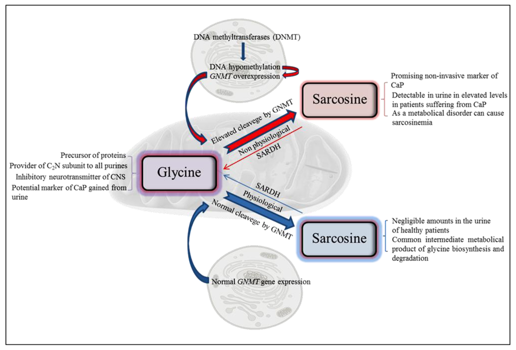 Due to properties of GNMT, its excessive production causes a cleavage of glycine to sarcosine and elevated the presence of sarcosine in urine (Figures 1 and 3). Stabler et al. reported that increased flux through of GNMT results in the increased formation of homocysteine and sarcosine through increased utilization of SAM []. This makes sarcosine interesting in the field of non-invasive cancer biomarkers. Elevated levels of sarcosine correlated with progression of prostate cancer and metastatic process. Supplementation of sarcosine to prostate cancer cell lines induced a selection of invasive phenotype in culture []. Dahl et al. reported for the first time on a significant upregulation of a potent oncoprotein human epidermal growth factor receptor 2 (HER2/neu) in androgen-dependent prostate cancer cells upon exposure to exogenous sarcosine. That indicates that sarcosine may be involved in regulation of HER2/neu. However, information about these cellular mechanisms will be needed for detailed clarification [].