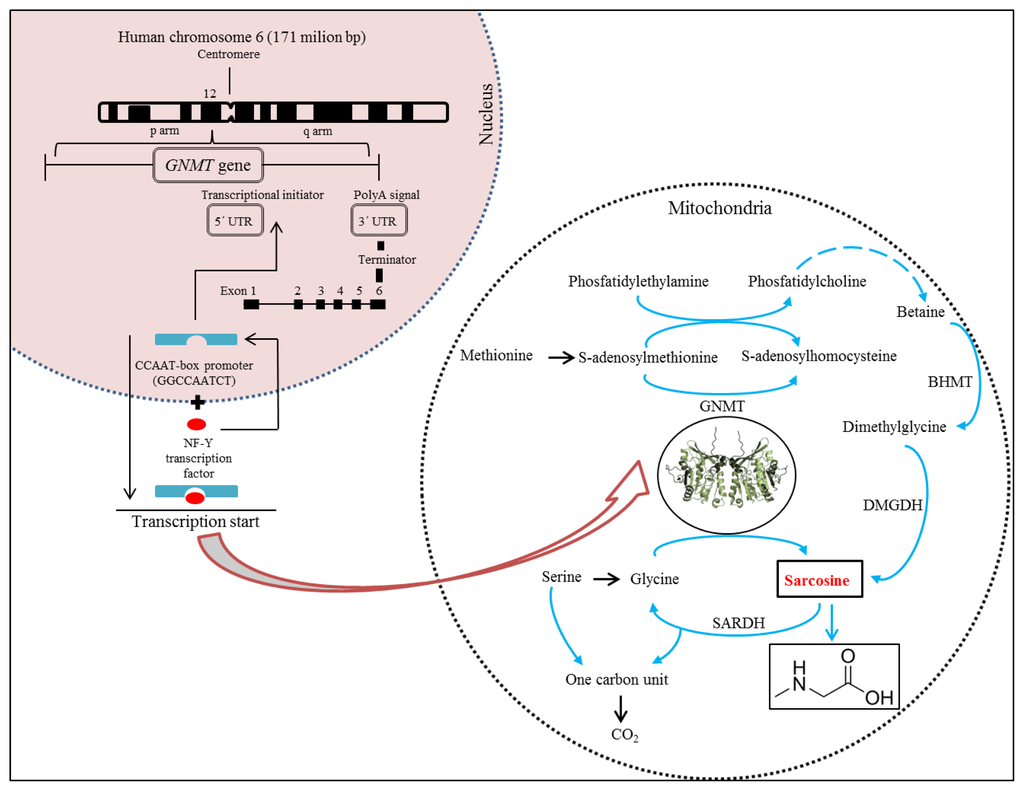Glycine N-methyltransferase (GNMT) acts as an essential component that influences synthesis of sarcosine [–]. Synthesis of GNMT is controlled by the same gene named GNMT. It has recently been reported that the GNMT gene is located on the short (p) arm of chromosome 6 at position 12 (Figure 3) and acts as a tumour-susceptible gene []. According to the study by Ianni et al., T allele of the rs9462856 SNP in the promoter region of the GNMT gene is overexpressed in patients suffering from CaP and its overexpression significantly increases the risk of the disease []. Phenotypic analysis of three GNMT haplotypes (A, B, and C) indicated that haplotype C had the highest promoter activity and haplotype B had significantly higher activity compared to the haplotype A. The difference between the haplotypes B and C is due to the T allele of SNP1 that exerts a strong disequilibrium []. The GNMT gene contains in TATA-less core promoter region the Sp1 site and a CCAAT-box [] that is one of the most ubiquitous elements being present in 30% of all eukaryotic promoters [–]. This region represents a binding site for the transcriptional factor, NF-Y, a trimer with histone-like subunits NF-YB/NF-YC and the sequence-specific NF-YA [,]. NF-Y is a sequence-specific transcription factor with nucleosome-like properties in nonspecific DNA binding that helps to establish permissive chromatin modifications at CCAAT promoters [].