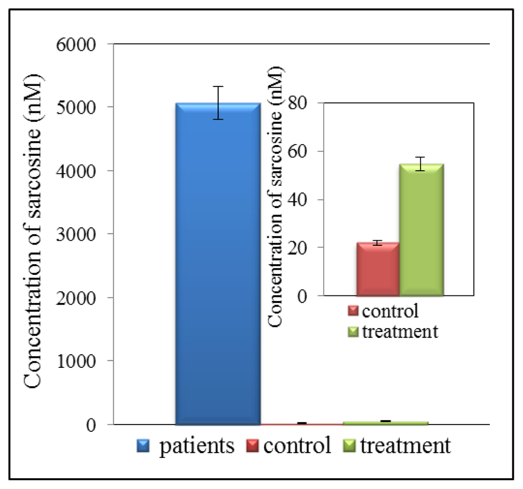 Non-proteinogenic amino acid sarcosine has a promising potential as a non-invasive marker of carcinoma of prostate as well as GNMT, which is closely connected with the presence and involvement of sarcosine in tissue of prostate tumours. Analytical demands on accurate and precise detection of low concentrations of sarcosine are high, and relatively expensive instrumentation is quite necessary. However, the limits of detection in units of nanograms can be achieved and reversed this fact. The finding that sarcosine does not occur in urine of healthy patients in detectable levels [,] and the necessity to eliminate negative results are very important for developing the low-cost, rapid, and reliable analytical methods.