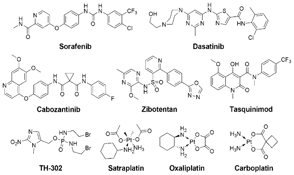 - Nabhan, C.; Villines, D.; Valdez, T.V.; Tolzien, K.; Lestingi, T.M.; Bitran, J.D.; Christner, S.M.; Egorin, M.J.; Beumer, J.H. Phase I study investigating the safety and feasibility of combining imatinib mesylate (Gleevec) with sorafenib in patients with refractory castration-resistant prostate cancer. Br. J. Cancer 2012, 107, 592–597. [Google Scholar]