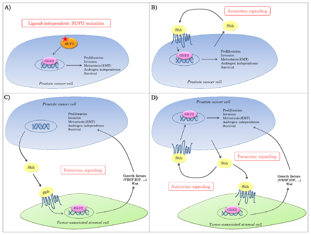 Increasing evidence suggests an active role for Hh signaling in the development and progression of PCa. However, there is still a lot of controversy about the exact mode of aberrant Hh signaling in PCa (Figure 1). Multiple components of the Hh pathway are present within chromosomal regions associated with susceptibility to human PCa. Nevertheless, loss-of function mutations in SUFU are the only known mutations in the Hh pathway in prostatic tumor tissues thus far (Figure 1A) [45,46]. In general, however, aberrant Hh signaling in prostate tumors is believed to be ligand-dependent. As described above, it remains controversial whether this is mediated in a paracrine and/or autocrine manner. On the one hand, it has been reported that Hh ligands produced by tumor cells signal to the tumor-surrounding stroma, thereby inducing the production of growth factors that support tumor growth and/or survival (Figure 1C) [34]. On the other hand, there are data suggesting that the tumor switches to an autocrine requirement for Hh signaling in which the tumor cells both produce and respond to the ligand (Figure 1B) [1,45,47]. It could also be that in some cases paracrine and autocrine mechanisms co-exist, so that Hh overexpression by the tumor cells orchestrates effective tumor growth by direct stimulation of tumor cell proliferation in an environment rich in supporting survival and angiogenic factors (Figure 1D). If this is the case, Hh antagonists might be particularly effective since these could suppress Hh signaling both in the prostate tumor as well as in its microenvironment.