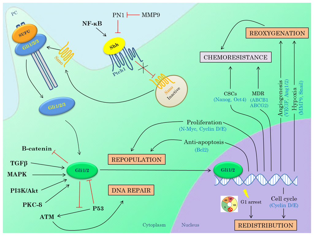 The response to radiation therapy is generally determined by the four R’s of radiobiology: repopulation, repair of sublethal DNA damage, redistribution in the cell cycle and reoxygenation of hypoxic regions. Targeting the Hh pathway could potentially affect all of these mechanisms, since Hh signaling regulates the transcription of many genes involved in these processes, Hh pathway activation could result in radiation resistance and therefore this could increase radiosensitivity of tumor cells (Figure 2).