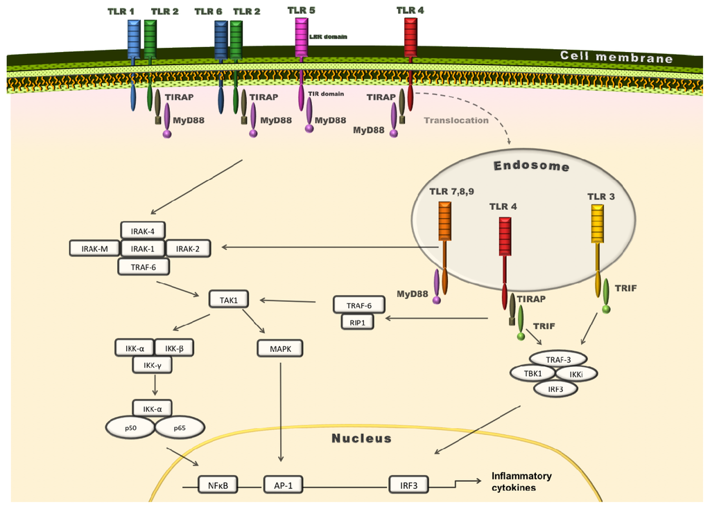 Upon ligand binding TLRs dimerise and most of them form homodimers, with the exception of TLR1/2, TLR2/6 and TLR4/6/CD36 which heterodimerise [33,51] Structurally, TLRs share an extracellular leucine-rich repeat domain (LRR), responsible for PAMP detection, and a Toll/Interleukin-1 receptor (TIR) domain. The latter dictates TLR-mediated signal transduction. Upon TLR ligand stimulation, the TIR-domain binds to TIR-domain adaptor proteins: myeloid differentiation primary-response protein 88 (MyD88), TIR domain containing adaptor protein (TIRAP) (also known as MyD88-adaptor-like or MAL) and TIR domain-containing adaptor inducing IFN-β (TRIF), the TRIF-related adaptor molecule (TRAM) resulting in two distinct signalling pathways: The MyD88-dependent and the MyD88-independent/TRIF-dependent pathways (Figure 1) [6,52].
