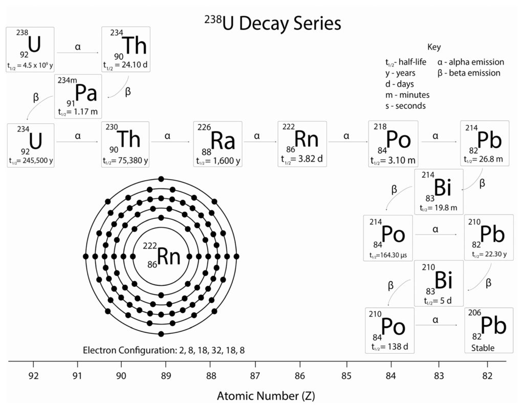 The decay series of uranium-238 indicating its decay products, their half-lives and the electron configuration of radon-222 complete with each respective atomic number.