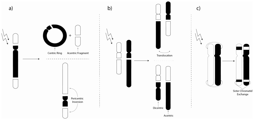 Examples of (a) intra-chromosomal aberrations (including pericentric inversions and the formation of centric rings and acentric fragments); (b) Inter-chromosomal aberrations (including translocations and the formation of dicentric and acentric fragments); and (c) Sister chromatid exchange (whereby genetic material is exchanged between two sister chromatids).