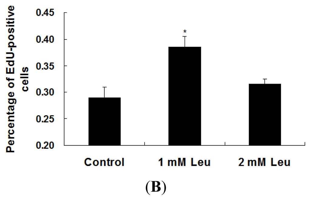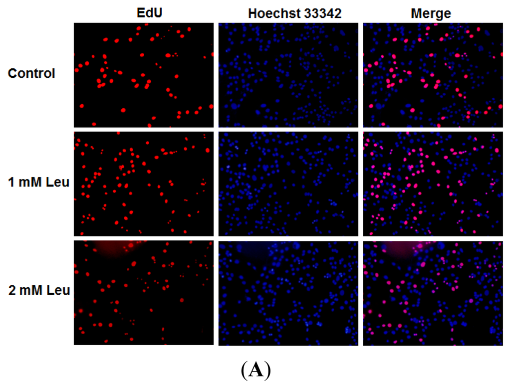 The baseline concentration of leucine in DMEM (Invitrogen cat. No. 11995065) used in this study is 0.802 mM. To investigate the effect of leucine on myoblast proliferation, C2C12 cells were supplemented with different concentrations of leucine and EdU incorporation experiments were performed to assess its proliferation. As shown in Figure 1, the proliferation-promoting effect was obvious when supplementing with 1 mM leucine, compared with the unsupplemented control. In the following studies, leucine was supplemented with 1 mM.