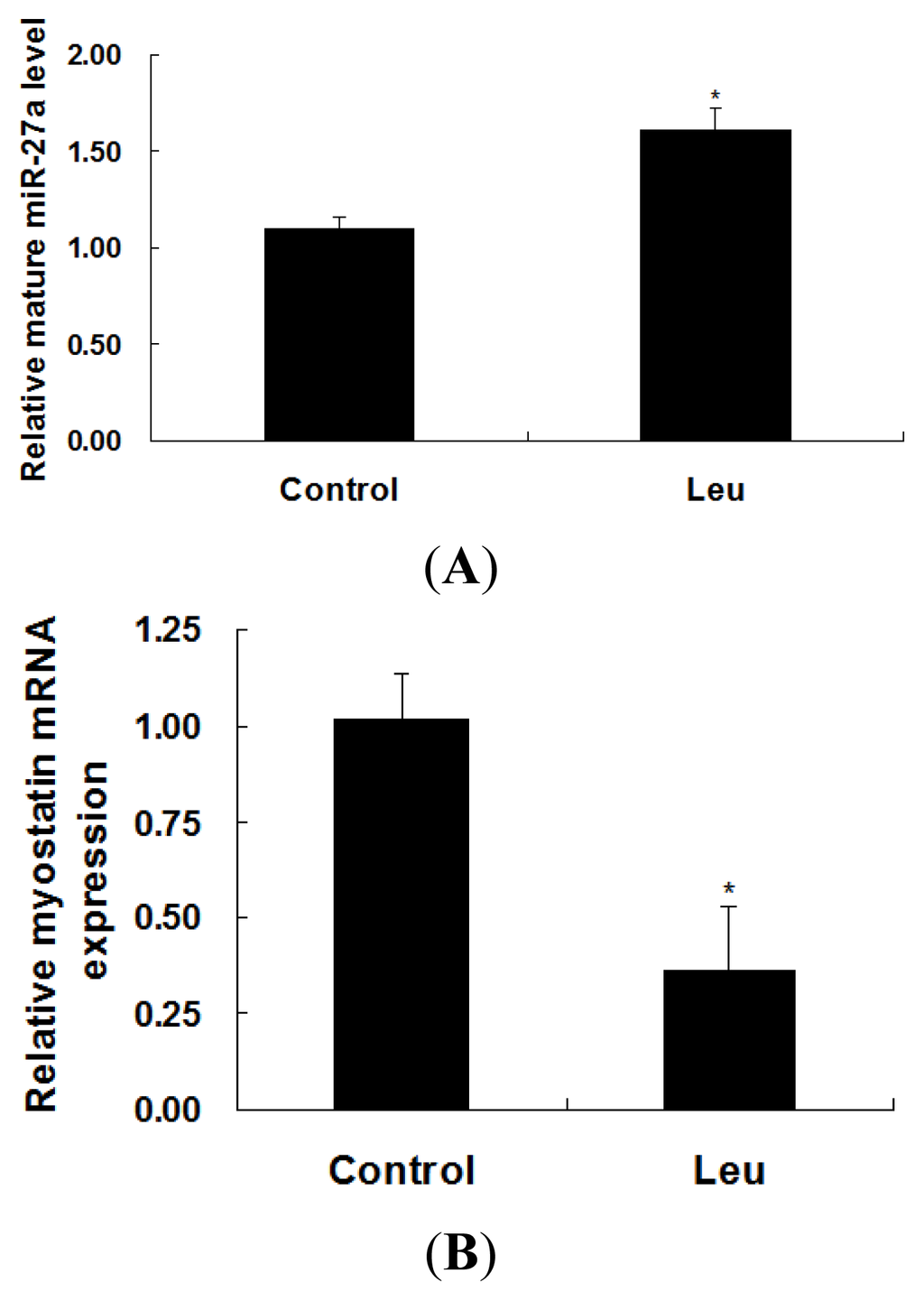 Expressions of miR-27a and myostatin in leucine-supplemented C2C12 cells were determined by real-time quantitative PCR. As shown in Figure 2, levels of miR-27a and myostatin mRNA were increased and decreased, respectively, following leucine supplementation.
