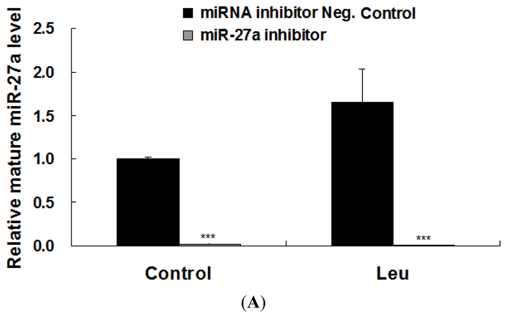 2.3. Promotion of Myoblast Proliferation by Leucine Is Reduced by miR-27a Inhibition