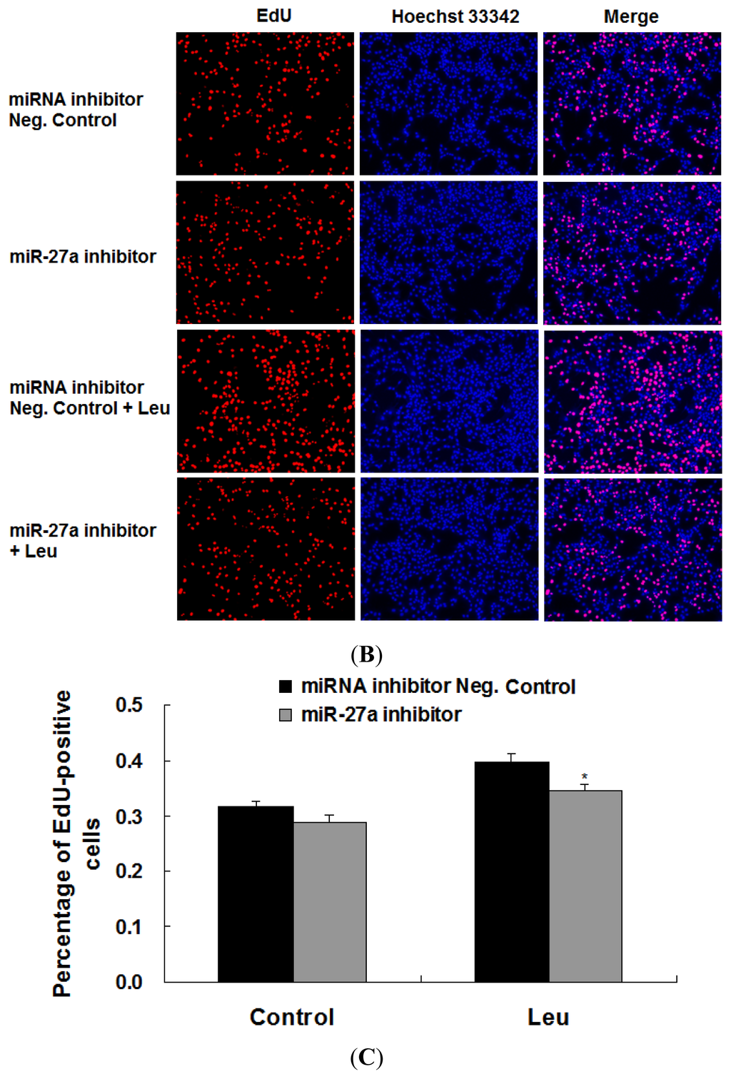 Experimental data obtained by our group have provided evidence that miR-27a can promote myoblast proliferation []. In this study, we showed that leucine had a proliferation-promoting effect on C2C12 cells and miR-27a was induced by leucine. These two lines of evidence indicate that leucine-induced upregulation of miR-27a may contribute to leucine-induced proliferation promotion of myoblast. In this study, an approximately 9% reduction of EdU-positive cells was observed in miR-27a inhibitor-transfected C2C12 cells compared to the control, although the difference was not statistically significant (p = 0.15). We also showed that inhibition of the endogenous miR-27a repressed the proliferation promotion of C2C12 cells caused by leucine. These results indicated that miR-27a contributed to leucine-induced proliferation promotion of myoblast.