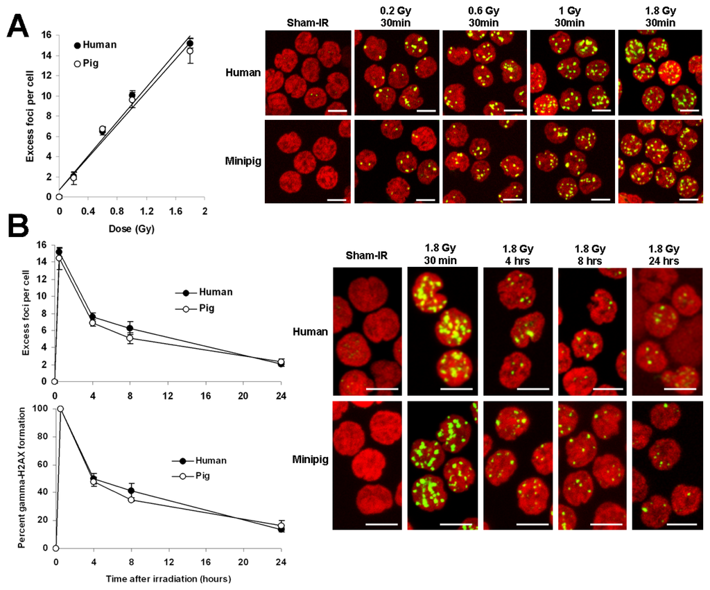 The goal of this study was to validate the use of the minipig model for γ-H2AX-based biodosimetry following a wide range of acute doses of ionizing radiation. We used the γ-H2AX focus assay for comparative assessment of DNA damage formation and repair kinetics in human and minipig irradiated ex vivo and in vivo, as well as in a primary-cell culture system (in vitro). Our data show that kinetics of DSB repair in minipigs are similar to those in humans. The integrity of DNA repair mechanisms in this model is supported by the reported low rate in swine of cancer incidence [], a pathology strictly associated with defective DNA repair []. The similarity of DSB repair kinetics (i.e., γ-H2AX loss) between human and minipig was confirmed by the observation of comparable radiation sensitivity in primary cell line survival assays (in vitro). The minipig seems well suited as an alternative large animal model for γ-H2AX-based biodosimetry. The accentuated sensitivity to irradiation exhibited by the Gottingen minipig with respect to other large animal models (NHP, dogs), as demonstrated by a LD50/30 of 1.78 Gy, does not appear to be due to gross deficiency in DSB repair.