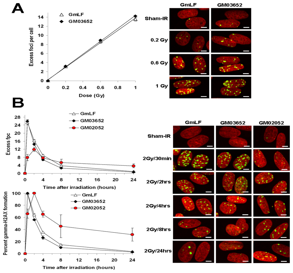 Comparison of γ-H2AX focus kinetics in human and minipig fibroblasts after ex vivo irradiation. (A) Cultures of human (GM03652) and minipig (GmLF) fibroblasts were irradiated with 0.2, 0.6, 1 and 1.8 Gy and incubated at 37 °C for 30 min. Cultures were fixed, stained, and imaged. Left, data plotted as excess γ-H2AX fpc ±SD (n = 3) vs. dose. Right, representative images. Green, γ-H2AX; red, DNA stained with PI. Chi-square test for trend between human and minipig dose responses: χ2 = 0.0018, p = 0.966 (no significant difference). p Values (Student’ t-test) between human and minipig responses for 0.2, 0.6 and 1 Gy are 0.647, 0.658 and 0.129 respectively (no significant difference); (B) Fibroblast cultures from normal (GM03652) or A-T diseased (GM02052) human subjects and from minipigs (GmLF) were irradiated with 2 Gy and incubated at 37 °C for various lengths of time, then prepared as described in panel A. Left panel, data plotted as excess γ-H2AX fpc ± SD (n = 3) (top chart) or as percentage of γ-H2AX foci remaining ±SD (n = 3) (bottom chart). Chi-square test for trend between human and minipig γ-H2AX kinetics: χ2= 0.3917, p = 0.5314 (no significant difference). p Values (Student’ t-test) between responses for 0.5, 2, 4, 8 and 24 h are 0.644, 0.085, 0.0517, 0.055 and 0.512 respectively (no significant difference). Right panel, Representative images of fibroblasts used for data acquisition. Green, γ-H2AX; red, DNA stained with PI. Scale bars, 10 μm.