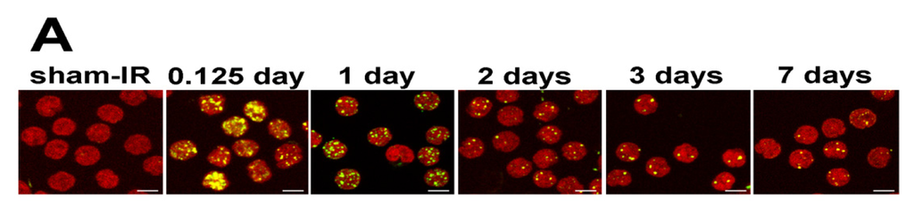 One immediate effect of radiation exposure is the formation of DNA double-strand breaks (DSBs), considered to be one of the most damaging DNA lesions. High DSB levels can lead to cell death while low levels may induce cellular senescence or genomic rearrangements that lead to cancer []. DSBs can be identified and quantified in situ by detecting the γ-H2AX foci formed at DNA break sites utilizing immunostaining techniques [,]. Counting γ-H2AX foci is the most sensitive of current assays for irradiation-induced DSBs [] with a ratio of DSBs to visible γ-H2AX foci close to 1:1 [,].