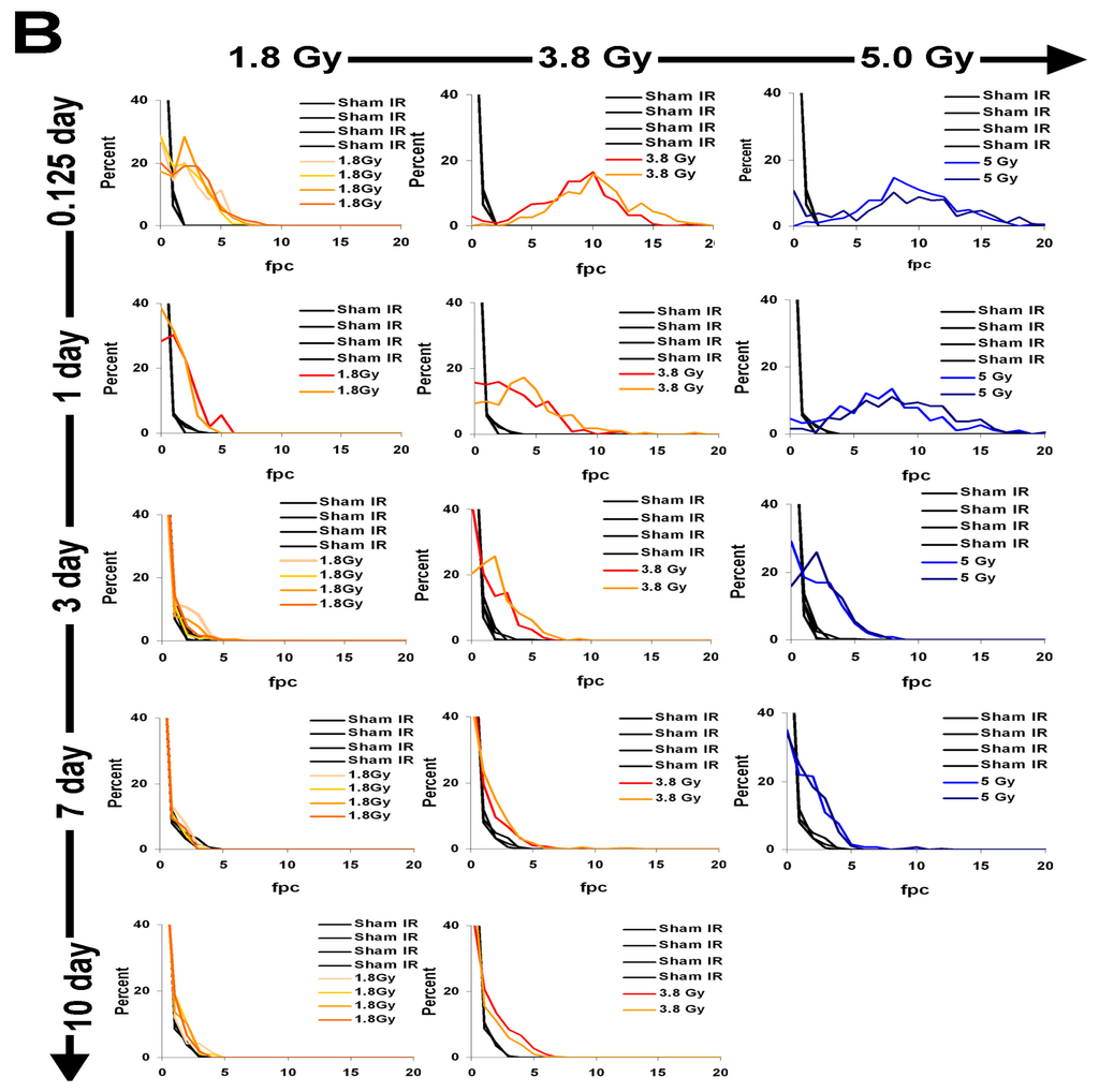 The kinetics of γ-H2AX focus formation and elimination for different TBI doses and recovery times were biphasic with a rapid decrease in focus numbers over the first 1–2 days (Figure 5). However, γ-H2AX focus numbers remained relatively stable after 3 days (Figure 5A). Fpc values for the 1.8-Gy samples differed significantly from those for the sham samples until 3 days post-exposure with 0.41 ± 0.18 fpc in the 1.8 Gy vs. 0.16 ± 0.06 in the sham. However, by 7 days post exposure, the fpc values of the 1.8 Gy and the sham samples were indistinguishable (0.26 ± 0.07 vs. 0.23 ± 0.06). In contrast, both the 3.8 and 5.0 Gy samples exhibited substantial responses for up to 10 and 7 days respectively (Figure 5A). The values at 7 days post-exposure were 1.48 ± 0.01 for 5.0 Gy and 0.98 ± 0.22 for 3.8 Gy vs. 0.23 ± 0.06 for sham-exposed, about 6.5 and 4.2 fold higher than the corresponding control values. At 10 days post-exposure the fpc value was 0.99 ± 0.27 for 3.8 Gy, about 5.5-fold above the corresponding control value (0.18 ± 0.00) (Figure 5A). However, while these animals responded similarly to the same doses of TBI, the SD values show that their responses were not identical (Figure 5A,B). A similar observation was previously made with the NHP model []. Interestingly, with 3.8 Gy-TBI, the fpc values remained similar between 7 and 10 days (0.98 ± 0.22 vs. 0.99 ± 0.27 at 7 and 10 days respectively). Similar observations were done in NHP lymphocytes after TBI []. The existence of these persistent foci suggests that a portion of irradiation-induced DSBs remained unrepaired in minipigs. While the molecular nature of these foci remains unknown, they may represent chromosome fragments or complex DNA lesions. Such lesions may be involved later on in cellular senescence and/or lead to chromosomal aberrations and micronuclei [,].