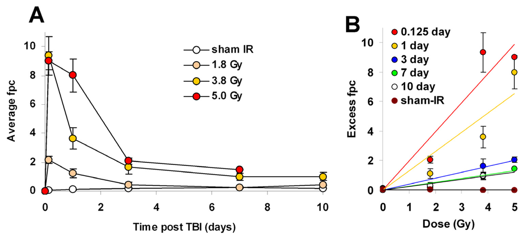 Kinetics for γ-H2AX focus formation and loss in peripheral blood lymphocytes following minipig total body irradiation (TBI). Foci were enumerated in images like those in Figure 4A for the above-noted times after zero, 1.8, 3.8, and 5 Gy. Values are expressed as average γ-H2AX foci per lymphocyte (average fpc) (A) or excess γ-H2AX foci per lymphocyte (excess fpc) ± SD (n = 4 for sham-IR and 1.8 Gy samples, n = 2 for 3.8 and 5.0 Gy samples) and plotted vs. time after irradiation (A); or dose (B). Animals irradiated with 5 Gy TBI died before the 10 day time point. Statistical differences (Student’s t-test) were observed between TBI and sham-IR for all times (p < 0.05) except for 7 days after 1.8 Gy (p = 0.632).
