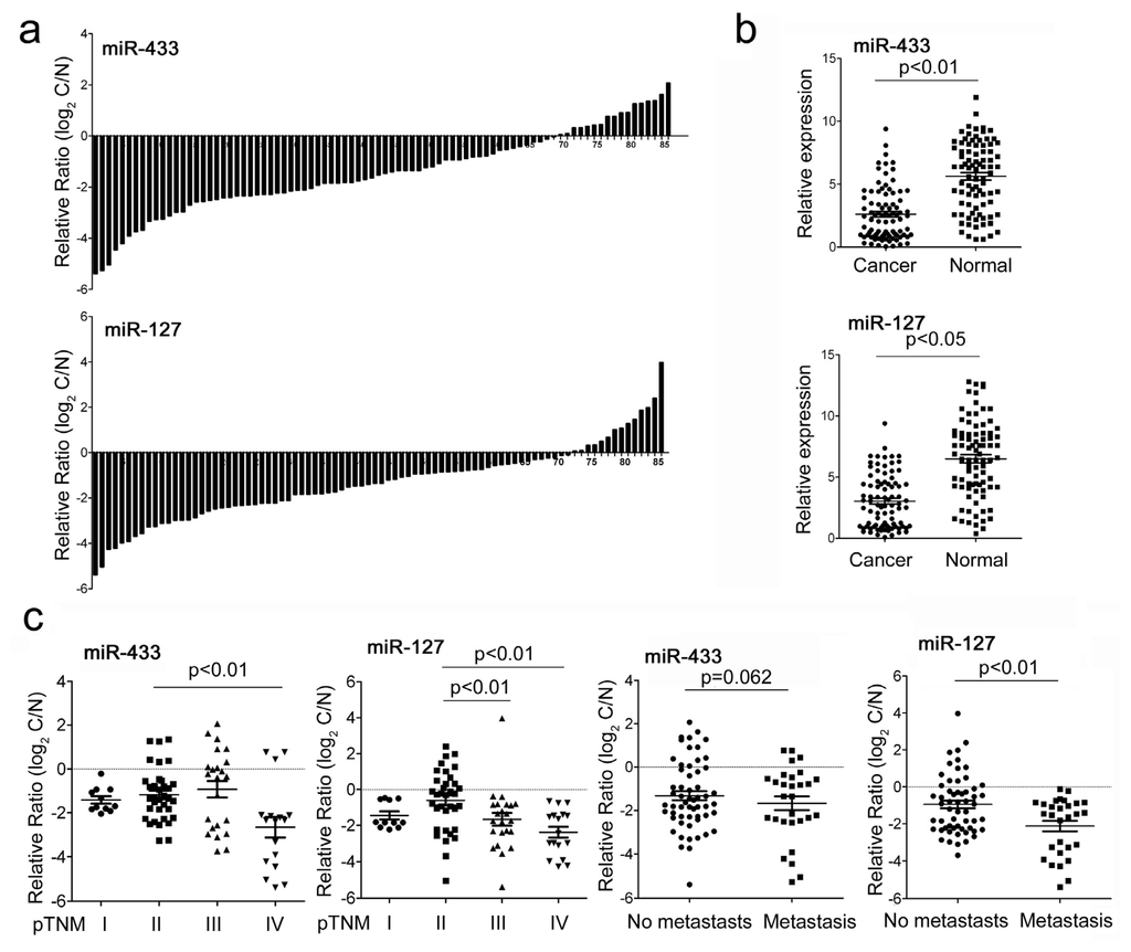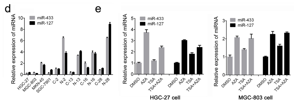 The expression of miR-433 and miR-127 in gastric cancer (GC) tissues and cell lines. (a) MiR-433 and miR-127 were detected in 86 pairs of GC tissues and its adjacent normal controls by quantitative RT-PCR. Data are presented as log2 of fold change of GC tissues relative to adjacent normal regions; (b) Relative miR-433 and miR-127 expression levels in GC tissues and adjacent normal regions; (c) The Statistical analysis of the association between miRNA level and pTNM stage (I, II, III and IV) and pM stage (No metastasis and Metastasis); (d) The relative level of miR-433 and miR-127 in GC cell lines (HGC-27,MGC-803, MKN-45 and SGC-7901) relative to four paired samples; (e) The expression of miR-433 and miR-127 in HGC-27 and MGC-803 cells after treatment with AZA,TSA or AZA and TSA.