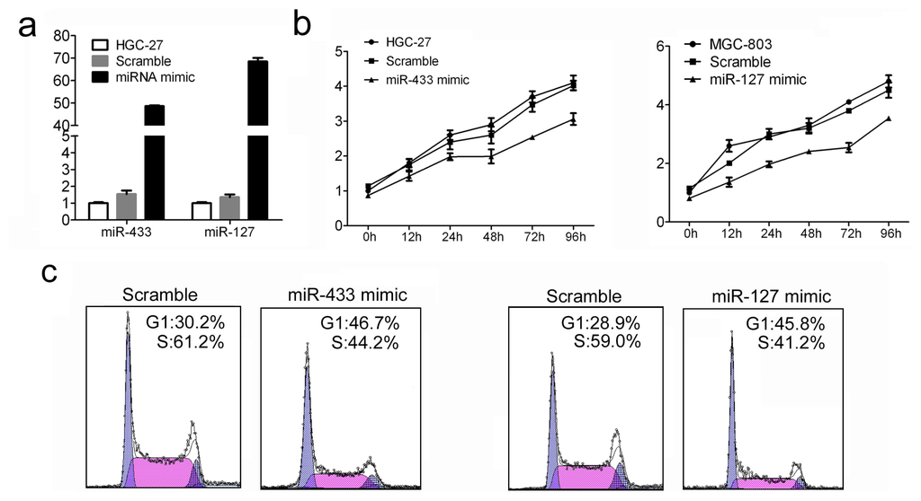 The influence of miR-433 and miR-127 on GC cell proliferation and cell cycle progression. (a) MiR-433 and miR-127 level were detected in HGC-27 cells after treatment with miRNA mimic (30 nM) or Scramble (30 nM) by quantitative RT-PCR; (b) Cell proliferation assay of HGC-27 cells after treatment with miRNA mimic or Scramble by using CCK-8; (c) Cell cycle analysis of HGC-27 cells after treatment with miRNA mimic or Scramble by Propidium Iodide (PI) staining.