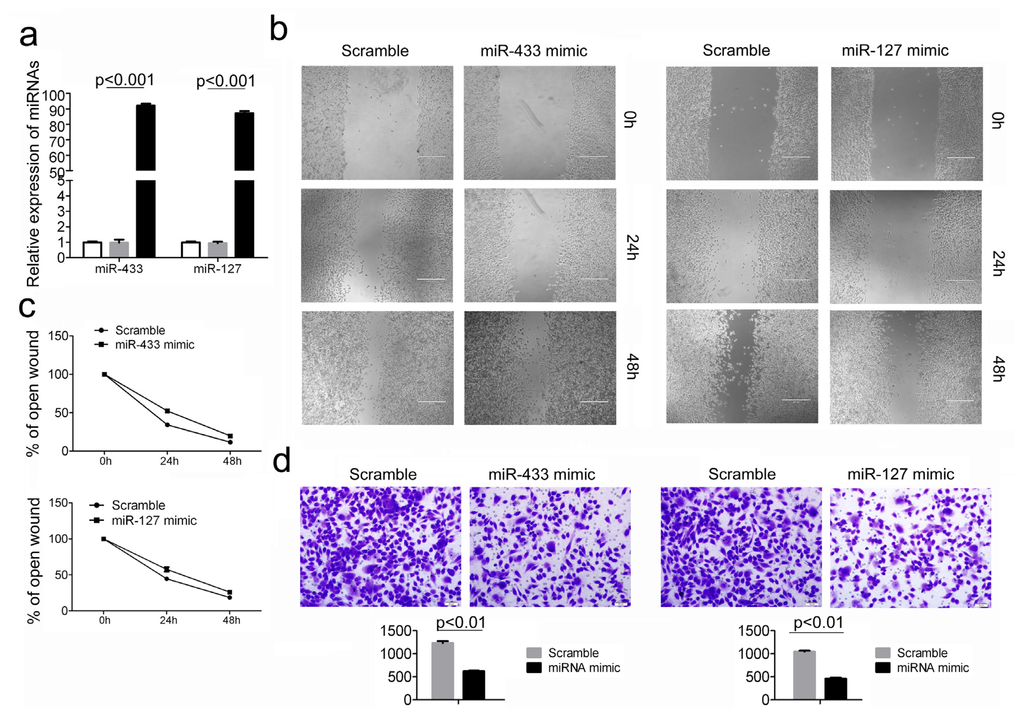 The influence of miR-433 and miR-127 on GC cell migration and invasion. (a) MiR-433 and miR-127 level were detected in HGC-27 cells after treatment with miRNA mimic or Scramble by uantitative RT-PCR; (b,c) Wound healing assays of HGC-27 cells after treatment with miRNA mimic or Scramble, The relative ratio of wound closure per field was shown in (c); (d) Transwell analysis of HGC-27 cells after treatment with miRNA mimic or Scramble, The relative ratio of invasive cells per field was shown below.