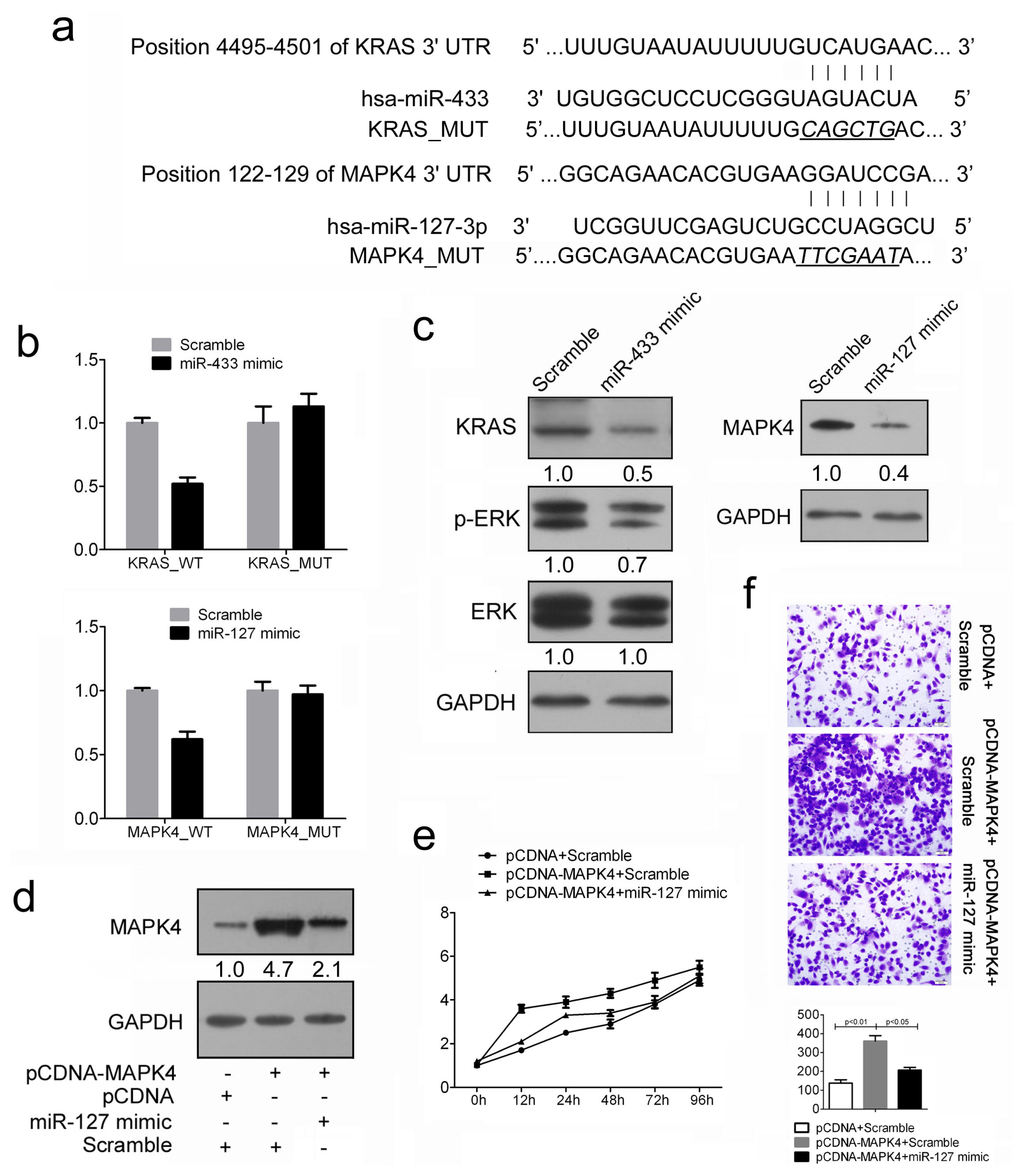 MiR-443 and miR-127 respectively target KRAS and MAPK4 in GC cells. (a) Schematic representation of KRAS and MAPK4 3′ UTRs showing putative miRNA target site; (b) Dual-luciferase analysis of reporter gene carrying KRAS and MAPK4 3′ UTR, co-transfected with miRNA mimic or Scramble; (c) Western blot analysis of KRAS and MAPK4 expression in HGC-27 cells transfected with miRNA mimic or Scramble. HGC-27 cells transfected with miR-433 mimics were also encountered with phosphorylated ERK (p-ERK) and total ERK analysis. Signals from Western blots are normalized to GAPDH, and the values, expressed as fractions with respect to the control, are indicated below; (d) Western blot analysis of MAPK4 in HGC-27 cells co-transfected with either miR-127 mimic (30 nM) or Scramble (30 nM) and 2.0 μg pCDNA-MAPK4 or pCDNA empty vector; (e) Cell proliferation assay of HGC-27 cells treated as described in d by using CCK-8; (f) Transwell analysis of HGC-27 cells treated as described in (d). The relative ratio of invasive cells per field was shown below.