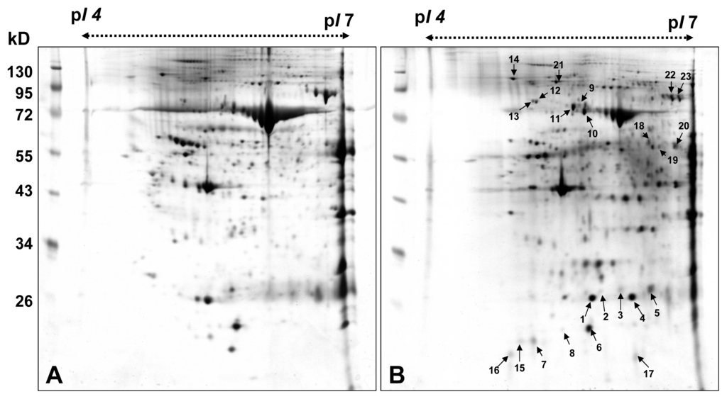 2-DE maps of (A) cholesteatoma tissues (pI 4–7) and (B) retroauricular skin (pI 4–7). A total of 23 differential proteins were identified by LC-MS/MS analysis (Table 2).
