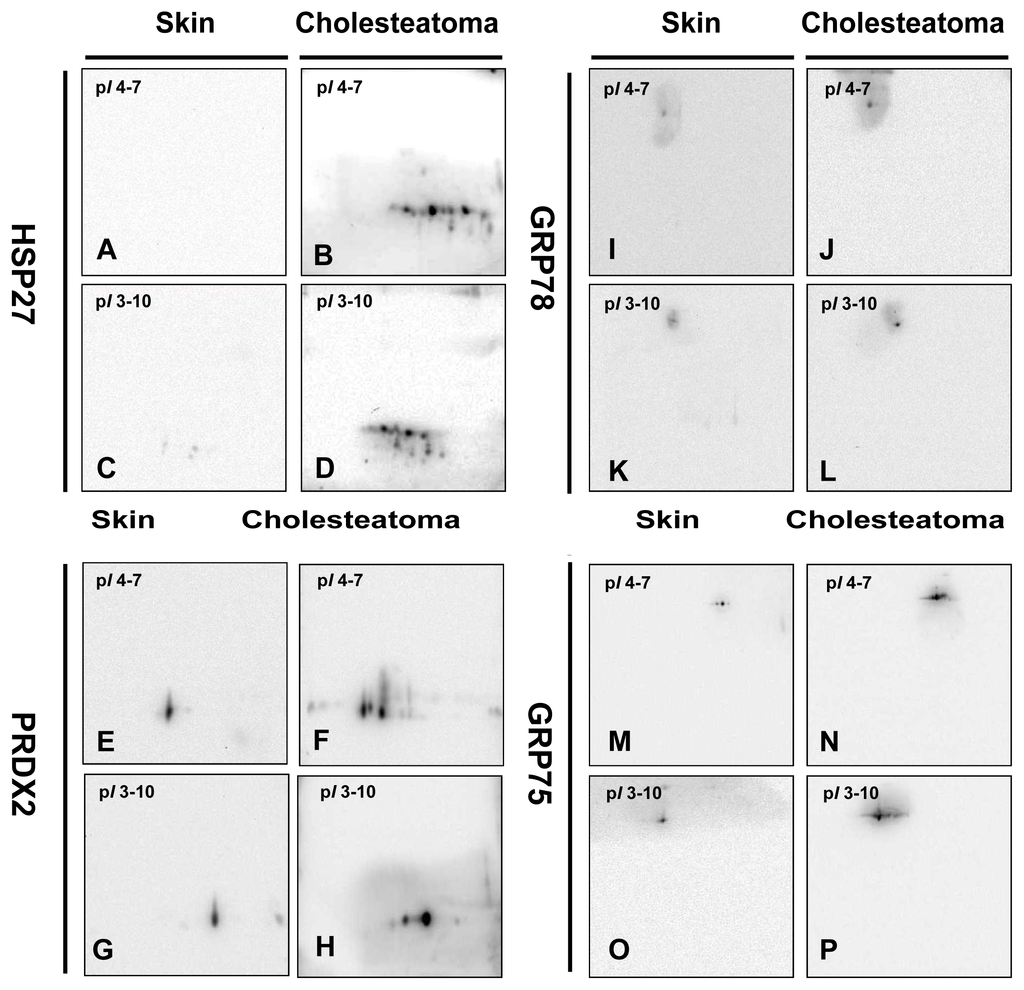 2D side-by-side comparison of the 2-DE Western blot images of HSP27, PRDX2, GRP78 and GRP75 in cholesteatoma tissues and retroauricular skin run with pI 4–7 and pI 3–10, respectively. Images A, B, C and D are for HSP27. Images E, F, G and H are for PRDX2. Images I, J, K and L are for GRP78. Images M, N, O and P are for GRP75.