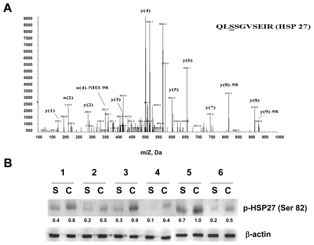 MS/MS profile and immunoblot data of phosphorylated HSP27. (A) MS/MS spectrum of phosphorylated HSP27 indicated the phosphorylation site at QLpSSGVSEIR; (B) Verification of phosphorylation-HSP27 (Ser-82) by Western blotting analysis. Cholesteatoma is presented by C, and retroauricular skin is presented by S. β-actin was used for normalization.
