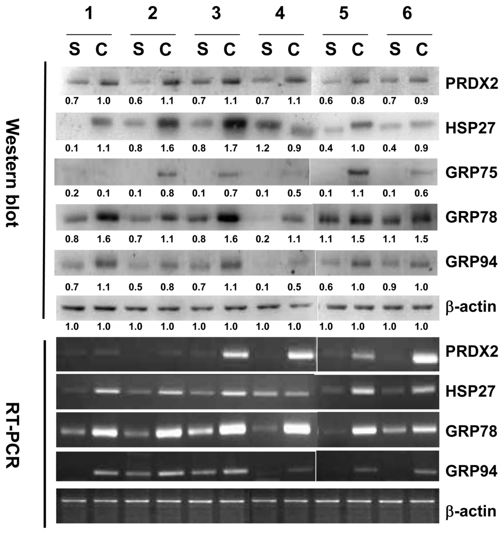 Validation of HSP27, GRP75, GRP78, GRP94 and PRDX2 by Western blotting analysis and RT-PCR. The tissues of cholesteatoma and retroauricular skin were collected from six individual patients. Cholesteatoma is presented by C, and retroauricular skin is presented by S. β-actin was used for normalization.