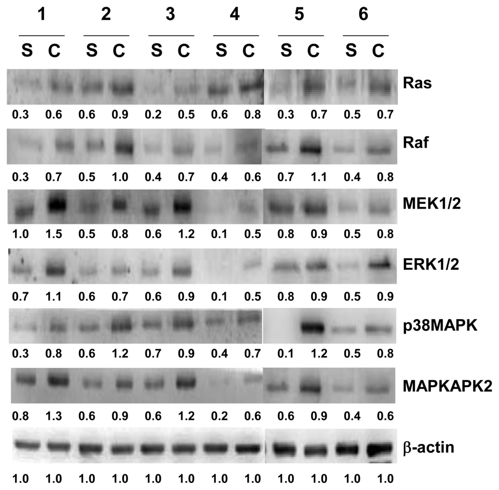 Validation of Ras, Raf, ERK1/2, MEK1/2, p38MAPK and MAPKAPK2 by Western blotting analysis. The tissues of cholesteatoma and retroauricular skin were from six individual patients. Cholesteatoma is presented by C, and retroauricular skin is presented by S. β-actin was used for normalization.