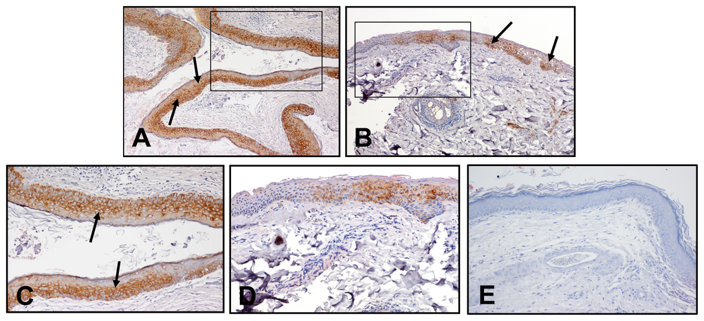 Immunoreactive staining of HSP27 for patient 5. (A,C) A strong and homogenous positive brownish staining in all layers of cholesteatoma epithelium (arrows). (B,D) Heterogeneous positive brownish staining in retroauricular skin (arrows) (C), (D). Immunoreactivity was confined to the cytoplasm of keratinocytes (arrows). The negative control was represented as (E). Magnification: (A and B) ×100; (A inset, C) ×200; (B inset, D) ×200; (E) ×200.
