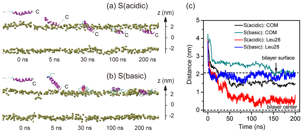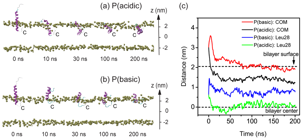 Figure 1 presents the pH-dependent pHLIP-POPC interaction in the two MD trajectories of S (acidic) and S (basic). The snapshots generated at five different time points in the two MD runs are displayed in Figure 1a,b. The time evolution of the insertion depth of pHLIP in POPC lipid bilayer is shown in Figure 1c. The bilayer insertion depth is probed by two parameters: One is the z-position of the COM of peptide backbone and the other the z-position of the most deeply inserted atom of residue Leu28. In acidic pH environment, the pHLIP moves toward the hydrophilic headgroup of the POPC bilayer and is adsorbed to bilayer surface within the first 5 ns, with its C-terminal residues binding to the headgroup region of the bilayer. This is followed by a spontaneous insertion of the C-terminal residues into the hydrophobic tail region of the bilayer and at t = 25 ns, the C-terminal residue Leu28 is located 0.5 nm below the phosphorous atoms (z = 2.05 nm) (see red curve in Figure 1c). It takes some time for the peptide to across the headgroup region. A full insertion of the pHLIP inside POPC bilayer is observed at t = 50 ns, with a z-position of 1.5 nm for backbone COM and 0.55 nm for the most deeply inserted atom of Leu28. Thereafter the peptide continues to move toward the hydrophobic center and at t = 100 ns, the z-position of the deepest atom of Leu28 reaches to 0.5 nm, although the backbone COM is still located at z = 1.5 nm. Interestingly, although the pHLIP is initially placed parallel to the membrane surface, the C-terminal residues firstly binds to the bilayer surface and directs the whole chain to insert into the bilayer. This is in accordance with the experiment results that the pHLIP insertion across a membrane is unidirectional with the C-terminal going first to insert [1,7].