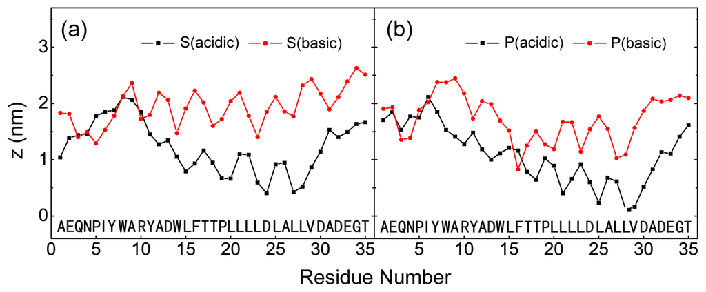 The z-position of the most deeply inserted peptide atom of each residue in POPC bilayer. The results are from four different MD runs: (a) S (acidic) and S (basic); (b) P (acidic) and P (basic). For each MD run, the z-position is an average of the last 50 ns.