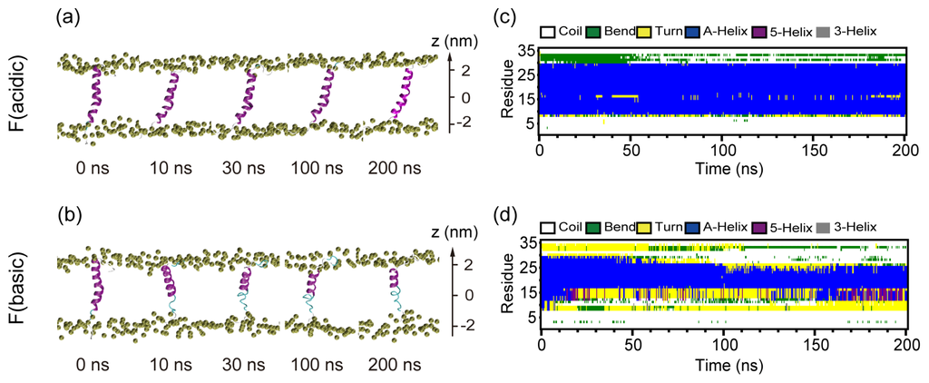 Detailed analysis of the two MD trajectories (F (acidic) and F (basic)) for full-insertion system at acidic and basic pHs. Snapshots at five different time points in the MD runs of (a) F (acidic) and (b) F (basic). The peptide is shown in ribbon. The phosphorous atoms of the lipids are shown in tan spheres to display the bilayer surface. The other atoms of POPC lipid molecules and water molecules are not shown for clarity. The bilayer center is set at z = 0. The secondary structure profiles of the pHLIP in the MD runs of (c) F (acidic) and (d) F (basic).