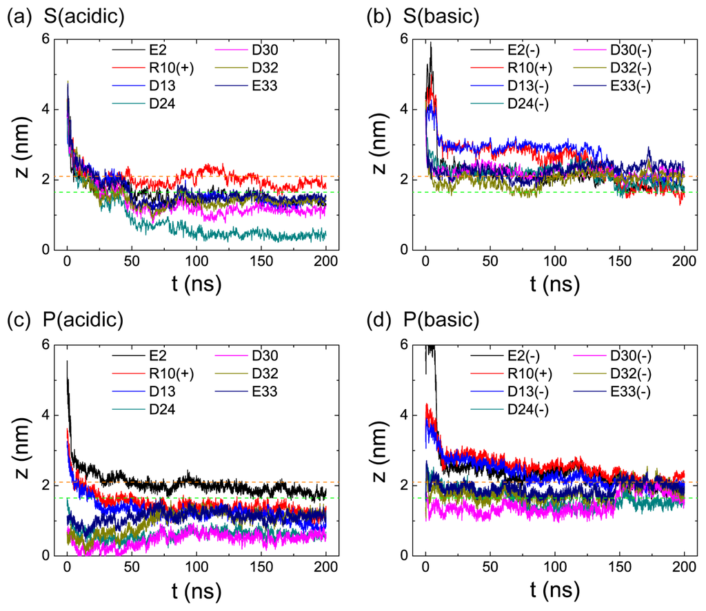 Time evolution of the minimum distance from bilayer center (z = 0) for each of the seven charged residues (E2, R10, D13, D24, D30, D32, and E33) in the four MD runs of S (acidic), S (basic), P (acidic), and P (basic).