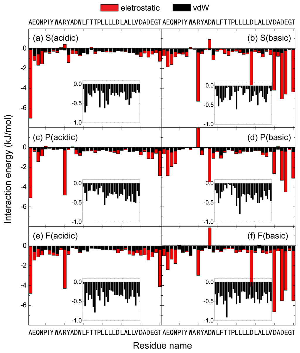 We then plot in Figure 6 the interaction energy between each amino acid residue and POPC lipid bilayer (per lipid) for the six different MD runs starting from the three different initial states. For each MD run, the interaction energy is averaged over the last 50 ns and decomposed into electrostatic and van der Waals (vdW) components. To compare the vdW interaction of each residue with POPG lipids at acidic and basic pH conditions, we present in the inset the vdW interaction energy using a different scale. It appears that the insertion depth is not directly correlated with the total vdW interaction energy between each residue and lipid molecule (tail and headgroup). Similar vdW interaction energies are seen in the six different systems. It can be seen from Figure 6 that the interaction energies between charged residues and POPC lipid are much stronger with respect to uncharged residues, indicating that electrostatic interactions play important role on the pH-dependent pHLIP-POPC interaction. The importance of electrostatic interactions between charged residues and lipid headgroups on the interaction of amyloid peptides with zwitterionic/charged lipid bilayers has also been reported in recent MD studies [28–31]. By comparing the peptide-lipid interaction energy in the left three panels with those in the right three panels in Figure 6, we see that the C-terminal polar residues Asp30, Asp32, and Glu33 display much stronger electrostatic interactions with POPC lipids at basic pH, which may prevent pHLIP from inserting into the lipid bilayer. The pHLIP has a net charge of −6 at basic pH and +1 at acidic pH. The peptide at basic pH is more hydrophilic, energetically more favorable to bind to hydrophilic headgroups of POPC bilayer, whereas the pHLIP at acidic pH is more hydrophobic, energetically more favorable to stay inside the hydrophobic tail region of POPC bilayer. This view is supported by the time-average potential energy calculation for the whole system (consisting of pHLIP, lipid bilayer, water molecules, and counterions) over the last 50 ns. Given the fact that the simulation timescales are too short to estimate the entropic contributions accurately, our analysis is only qualitative and indicative. The total potential energies of S (acidic), P (acidic), and F (acidic) system are −5590, −5818, and −5835 kJ/mol, respectively, with the potential energy of F (acidic) system being the lowest (−5835 kJ/mol). The total potential energies of S (basic), P (basic), and F (basic) are −8784, −9166, and −8475 kJ/mol, respectively, with the potential energy of F (basic) system being the highest (−8475 kJ/mol).