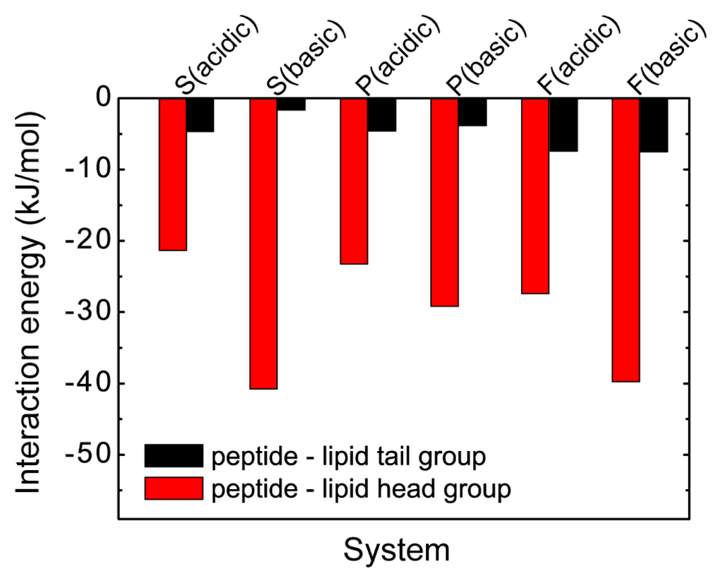 To understand further the physical driving forces underlying the pH-dependent pHLIP-POPC lipid interaction, we have calculated the interaction energies of pHLIP with the polar headgroup and the hydrophobic tail group of POPC lipid (per lipid) in the six different MD runs. The results are given in Figure 7, showing that the interaction energy of the peptide-lipid headgroup is much larger than that of peptide-lipid tail group in both acidic and basic pH conditions, indicating that pHLIP peptide has a strong interaction with the lipid head group. Moreover, the peptide-lipid head group interaction in basic pH solution condition is much stronger than that in acidic pH condition, which may induce the peptide to bind to POPC bilayer surface at basic pH rather than to insert into the bilayer. The results in Figure 6, together with those in Figures 5 and 7, indicate that at acidic pH, the protonation of the transmembrane residues Asp and the C-terminal residues Asp/Glu results in an increased hydrophobicity of pHLIP, facilitating their bilayer entry, while at basic pH, the strong electrostatic interaction between Asp/Glu residues and lipid headgroups hinders bilayer insertion of the pHLIP peptide. Notably, it was suggested in a recent MD simulation study that the electrostatic attraction between transportan 10 and POPC headgroups is the main bottleneck for the peptide across the bilayer [19].