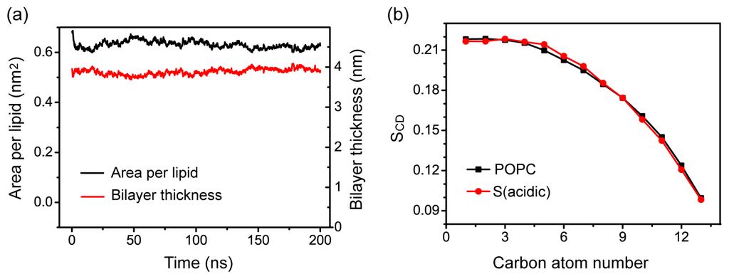 Characterization of the ordering of POPC bilayer. (a) Time evolution of area per lipid and bilayer thickness in simulation S (acidic); (b) Time-averaged order parameter SCD of sn-1 chain of POPC lipids over the last 50-ns of MD run of S (acidic). For comparison, the SCD of sn-1 chain obtained from a 20 ns MD run for pure POPC lipid bilayer is also presented.
