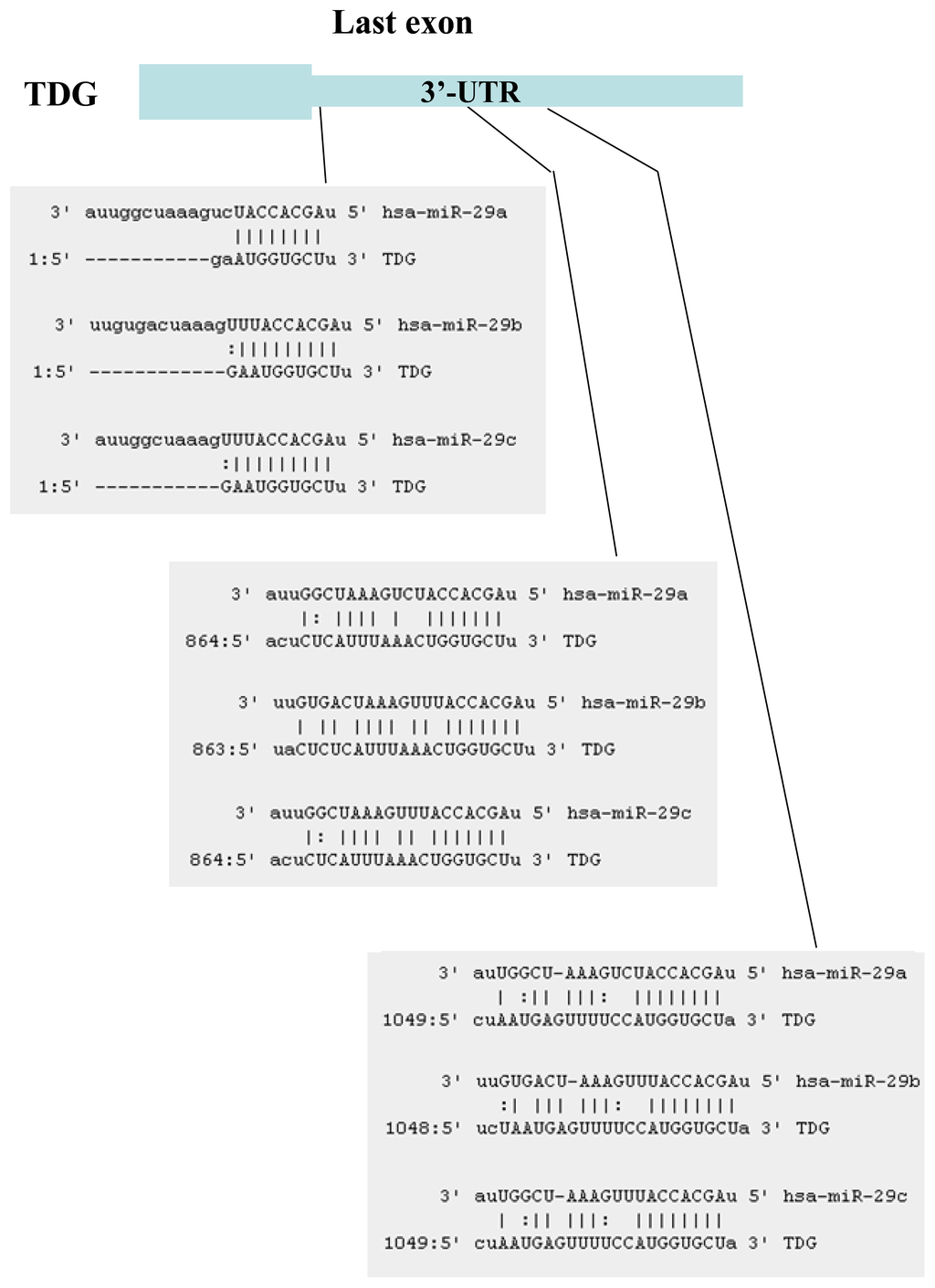 Three miR-29 target sites are present in the 3′-UTR of thymine DNA glycosylase (TDG).