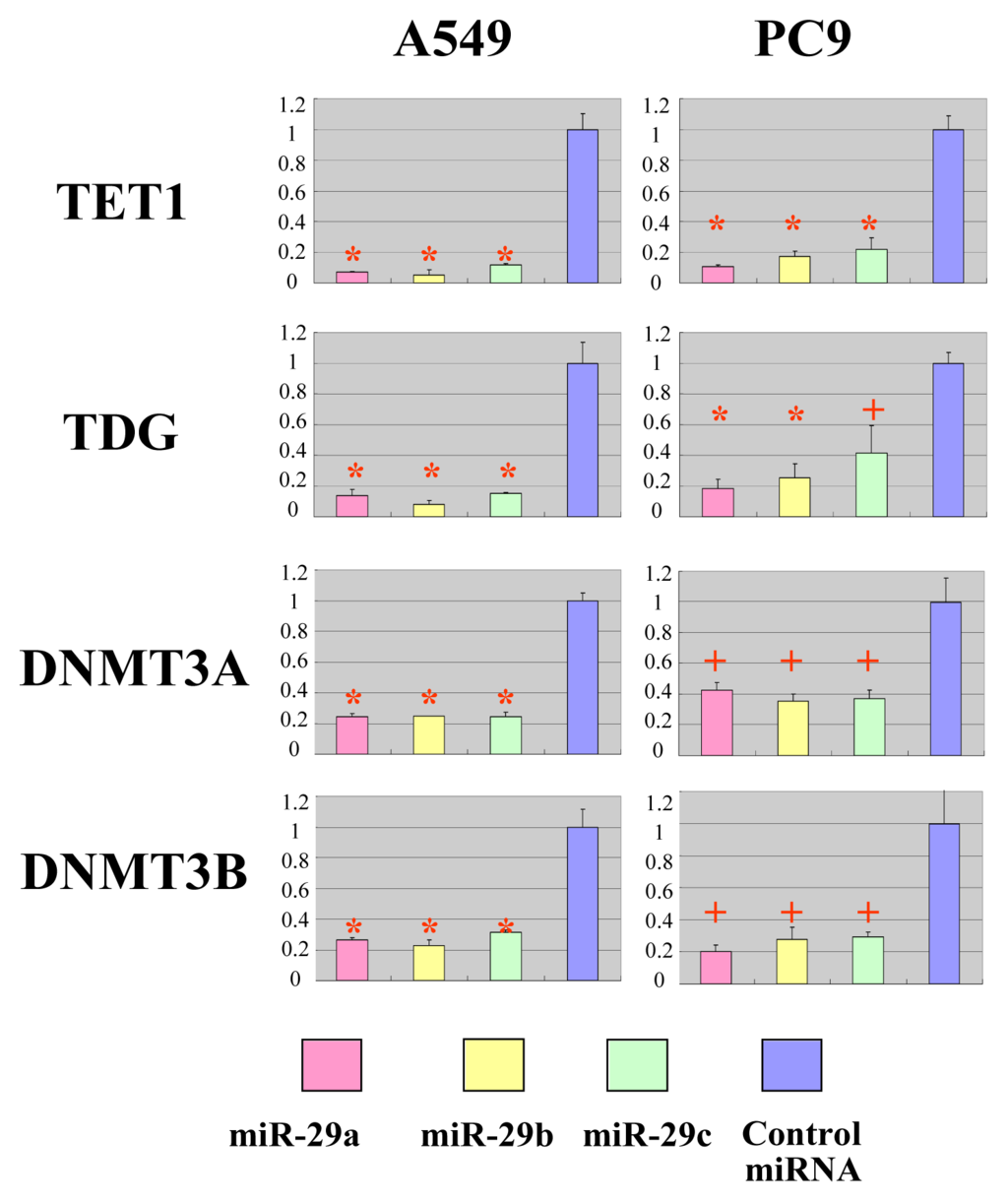 Members of the miR-29 family target the 3′-UTRs of TET1 and TDG. Luciferase activity of the TET1, TDG, DNMT3A and DNMT3B constructs was measured 48 h after cotransfection of A549 or PC9 cells with miR-29 or control miRNA. For each construct and cell line, data are normalized to the activity of cells transfected with control miRNA. Data show the mean + SD for n = 3 repeats. *p < 0.01, +p < 0.05, compared with control miRNA.