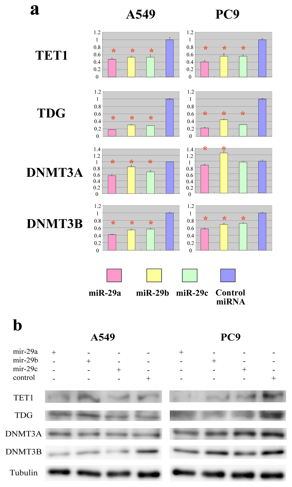 Members of the miR-29 family impact endogenous TET1 and TDG. (a) Expression of mRNA. Quantitative RT-PCR analyses of the expression levels of TET1, TDG, DNMT3A and DNMT3B mRNAs were performed 48 h after transfection of A549 or PC9 cells with miR-29 or control miRNA. The actin gene was used to normalize the quantification of expression. Data are normalized to the mRNA expression in cells transfected with control miRNA. Data show the mean + SD for n = 3 repeats. *p < 0.01, compared with control miRNA; (b) Protein level. Western blots of TET1, TDG, DNMT3A and DNMT3B were performed 48 h after transfection of A549 or PC9 cells with miR-29 or control miRNA. The tubulin protein was used as endogenous control.