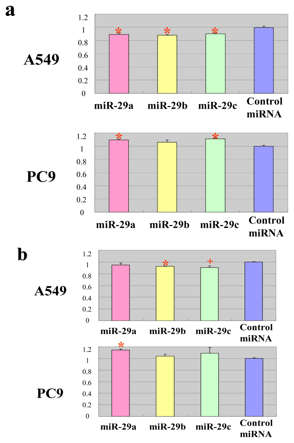 The DNA methylation level of cells transfected with miR-29 or control miRNA. (a) The global DNA methylation level. A luminometric methylation assay (LUMA) assay was performed 48 h after transfection of A549 or PC9 cells with miR-29a, miR-29b, miR-29c or control miRNA. Data are normalized to the DNA methylation ratio of cells transfected with control miRNA. Data show the mean + SD for n = 3 repeats. *p < 0.01, compared with control miRNA; (b) The DNA methylation level of RASSF1. A quantitative methylation-specific PCR of RASSF1 was performed. *p < 0.01, +p < 0.05, compared with control miRNA.