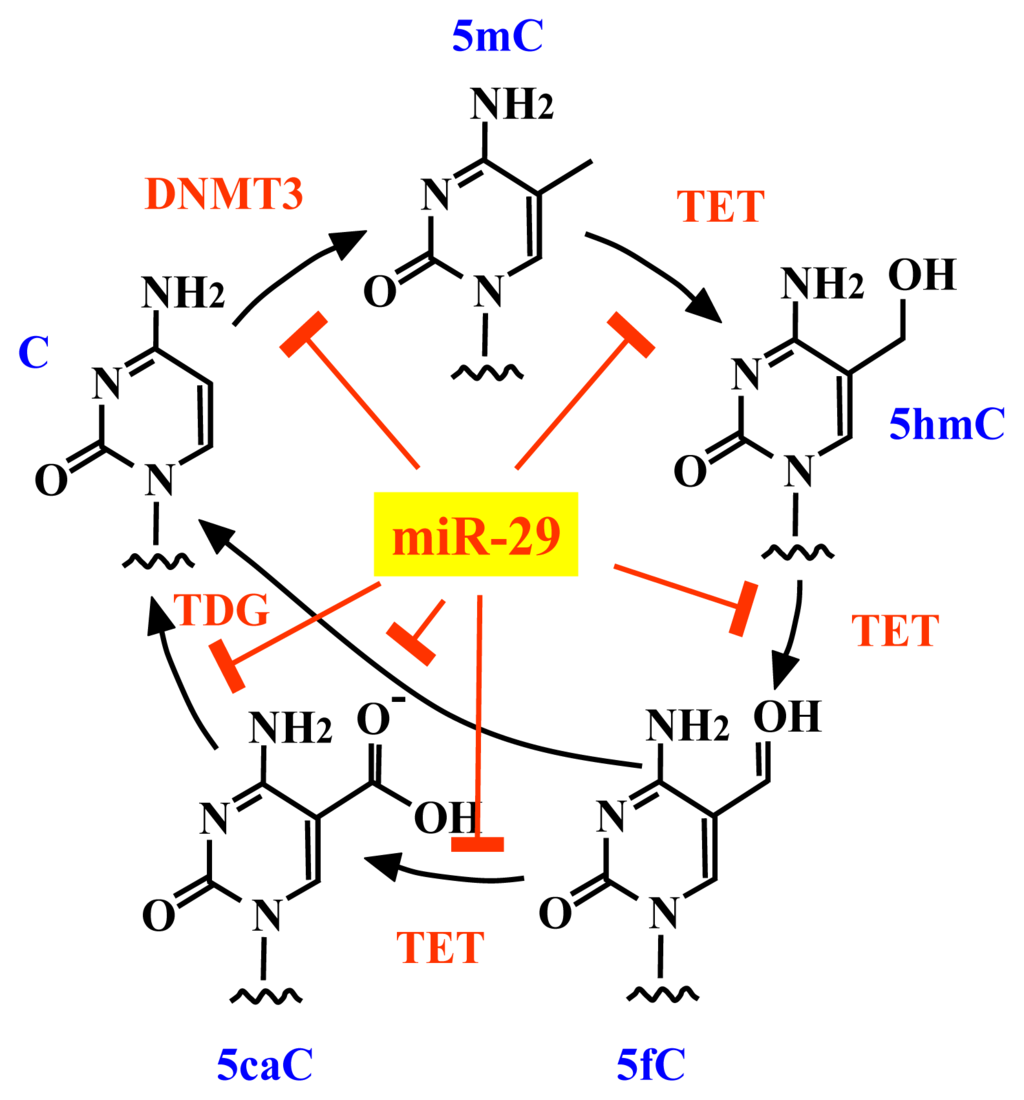 Regulation of DNA methylation by miR-29. Activities of DNMTs and DNA demethylases (TET, TDG) are repressed by miR-29. C, cytosine; 5mC, 5-methylcytosine; 5hmC, 5-hydroxymethylcytosine; 5fC, 5-formylcytosine; 5caC, 5-carboxylcytosine.